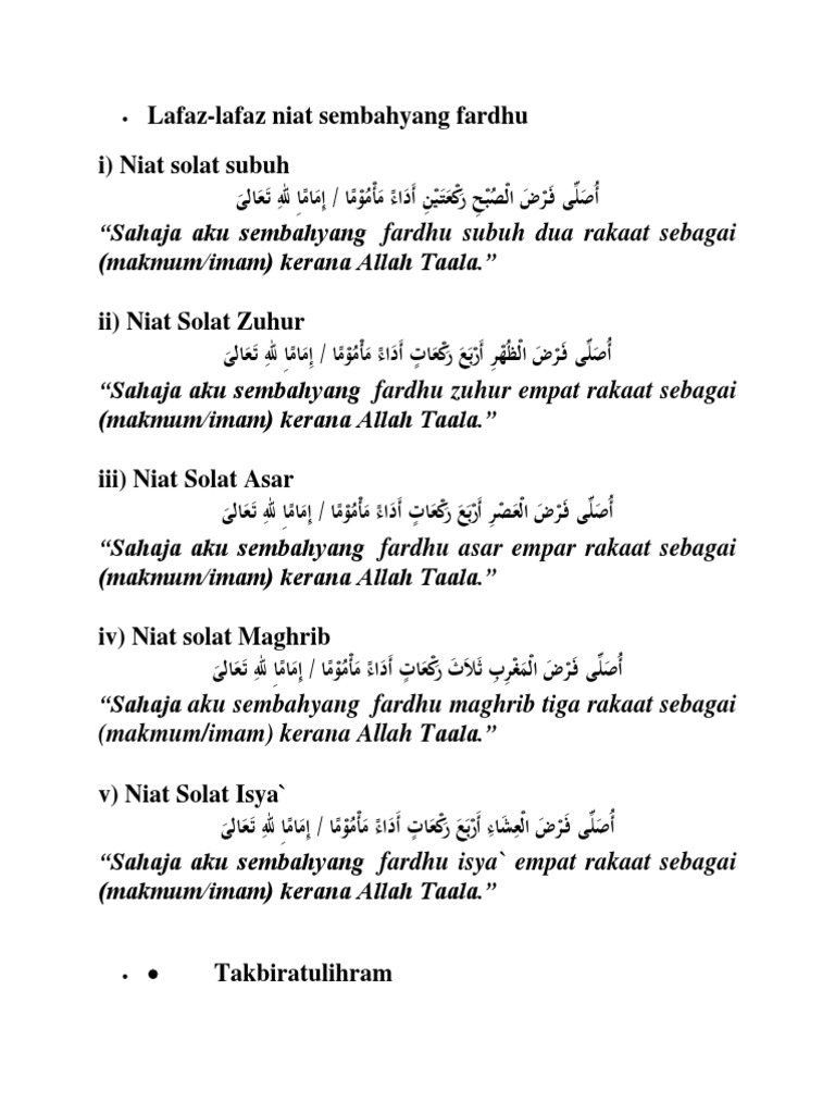 A aa ab aba aba-aba abad abadi abadiah abadiat abadikan abah abai abaikan abaimana abak abaka abaktinal abakus. Niat dalam Bahasa Melayu. Niat tersebut hendaklah dilakukan semasa berada dalam waktu zohor lagi. Niatnya lebih kurang begini Sahaja aku akan mengerjakan solat fardu Zohor jamak takhir di waktu Asar nanti. Niat Untuk Asar Usolli Fardol Asri Qosron Rakataini Jama Takhirin Lillahi Taala.